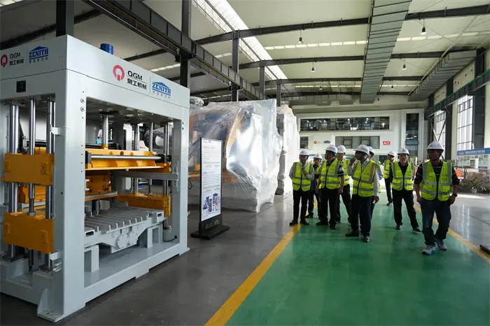 Anschließend begaben sich die Gäste in den Ziegelmuster-Ausstellungsbereich und sahen sich verschiedene hochwertige durchlässige Ziegel, Pflastersteine, Blöcke und andere Produkte an, die mit QGM-Geräten hergestellt wurden, und zeigten großes Interesse an den technologischen Errungenschaften des Unternehmens im Bereich „Festabfallrecycling“. Im Ausstellungsbereich der Ziegelherstellungsausrüstung inspizierten der Vorsitzende Lin Boqian und seine Gruppe die Kernausrüstung wie die vollautomatische Blockformmaschine und die intelligente Produktionslinie, die von QGM unabhängig entwickelt wurden, genau und tauschten vor Ort technische Vorteile und Marktanwendungsaussichten aus. Der Vorsitzende Lin Bo bekräftigte voll und ganz die herausragenden Beiträge von QGM in den Bereichen Herstellung von High-End-Geräten und umweltfreundlichen Baumaterialien und betonte: „QGM ist ein innovatives Modell privater Unternehmen in Quanzhou. Wir hoffen, auch in Zukunft die Rolle des Verbandes als Brücke zu spielen, die koordinierte Entwicklung der Industriekette zu fördern und dazu beizutragen, dass „Quanzhou Smart Manufacturing“ global wird.“ Der stellvertretende Generaldirektor Fu Huabin antwortete, dass das Unternehmen seine Investitionen in Forschung und Entwicklung weiter erhöhen und mit Partnern aus allen Gesellschaftsschichten zusammenarbeiten werde, um neue Möglichkeiten für die integrierte Entwicklung intelligenter Geräte und umweltfreundlicher Fertigung zu erkunden.