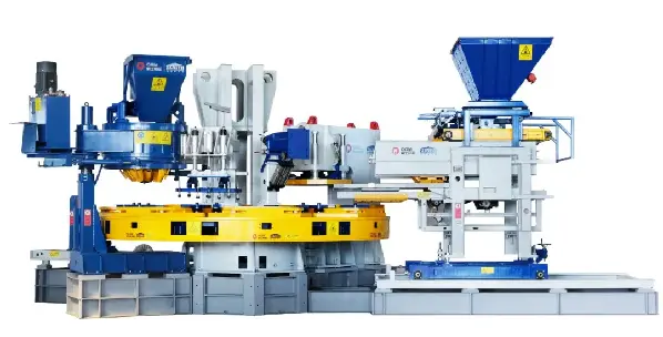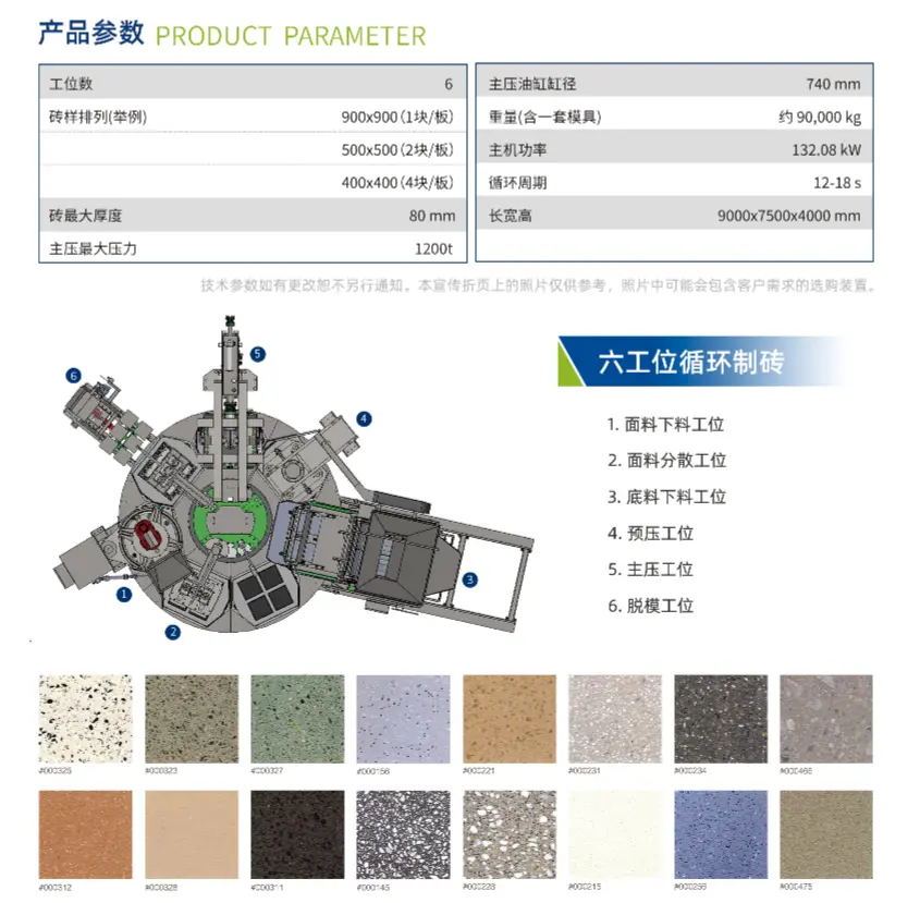 Die statische Rotationstischpresse HP-1200T unterteilt den Ziegelherstellungsprozess auf kreative Weise in 7 Stationen, die kreisförmig angeordnet sind, wodurch die Stellfläche reduziert wird. Sie verfügt über eine große Formfläche und einen großen Formhöhenbereich, um sicherzustellen, dass die unterschiedlichen Anforderungen der Kunden an Betonsteinimitationsprodukte erfüllt werden, und schließt die Lücke bei inländischen Rotationsmaschinen für Steinimitationsziegel mit sieben Stationen. Sein formulierter Gruppenstandard „T/CCMA 0125-2022 Rotary Multi-station Static Press Concrete Block Forming Machine“ wurde als eines der 100 Demonstrationsprojekte für Gruppenstandardanwendungen des Ministeriums für Industrie und Informationstechnologie im Jahr 2023 ausgewählt.