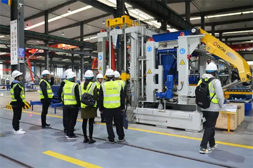 Als Besucher in den intelligenten Produktionsworkshop von QMG eintraten, beobachteten sie die vollautomatische Blockformmaschine aus der Nähe. Die Maschinenbehörde wiegt Hunderte von Tonnen, das Hydrauliksystem mit Präzisionsübertragung, die Formeinheit mit anpassbarem Wechsel ... "Diese Ausrüstung passt sich schnell an die Kundenbedürfnisse durch modulares Design an. Der Vizepräsident und seine Partei erkannten hoch an, dass das Dual-Wheel-Antriebsmodell der QMG-Ausrüstung und der Verkaufsmaterialien von den Verkaufsausrüstungen bis zur Bereitstellung von Ausrüstungen im Allgemeinen die Grünen ausgerichtet hat. "