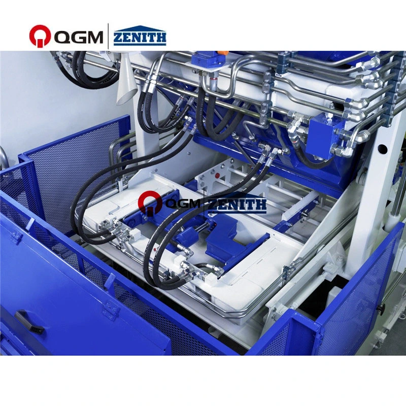 (4) Zuschlagstoffzufuhrsystem. Zufuhrgerät mit hydraulischem Antrieb; Kann die Führungen der Zuführungsbox auf einer hochpräzisen Schiene mit veränderbarem Drehmoment an unterschiedliche Formen anpassen, Durchmesser des Zufuhrführungsrads Ø 80 mm; Hydraulisch angetriebener Schwenkschaber (dreiteilig) zur gründlichen Reinigung der Formoberfläche; Der hydraulisch angetriebene Verteilerrost sorgt für eine gleichmäßige Verteilung des Betons in der Form; Höhenverstellbare Reinigungsbürste, befestigt an der Vorderwand der Futterschublade zur Reinigung der Tamperkopfschuhe...